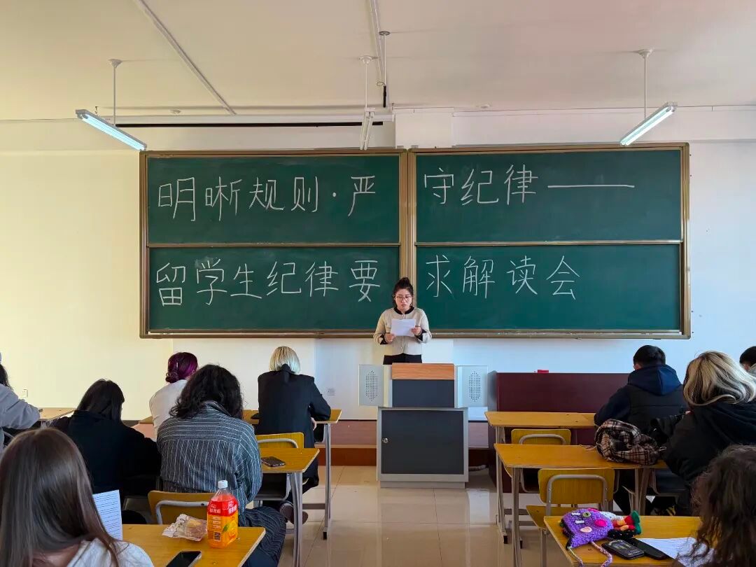 为全面筑牢校园安全基石,进一步强化学校留学生的规则意识与纪律观念,针对近期出现的一些问题,国际教育交流学院于2025年11月18日组织召开全体留学生大会,就《留学生在校期间管理规定》进行了全面、深入的专项解读与强调。本次会议以“遵规守纪,知行合一”为核心主旨,旨在通过系统的政策宣讲与案例警示,帮助留学生准确理解中国法律法规及学校规章制度的各项要求,明确行为边界,避免安全问题发生,共同营造一个安全、和谐、有序的校园学习与生活环境。...