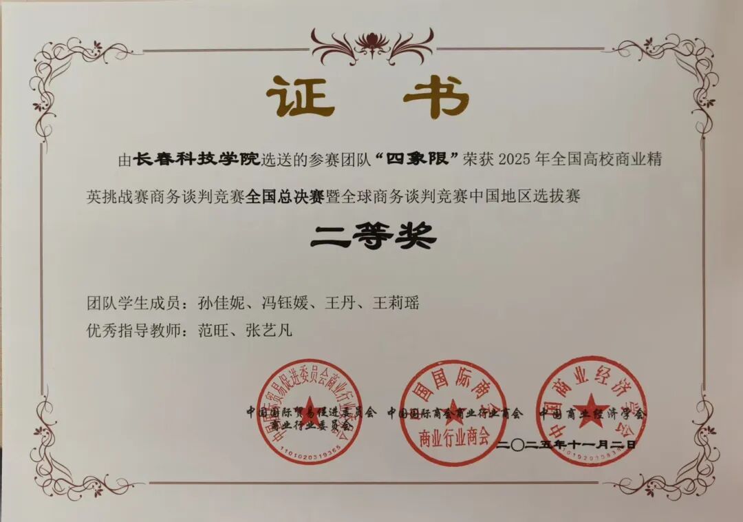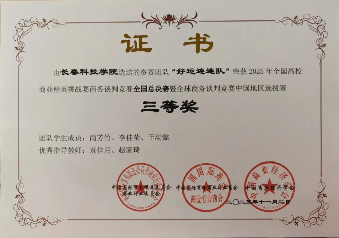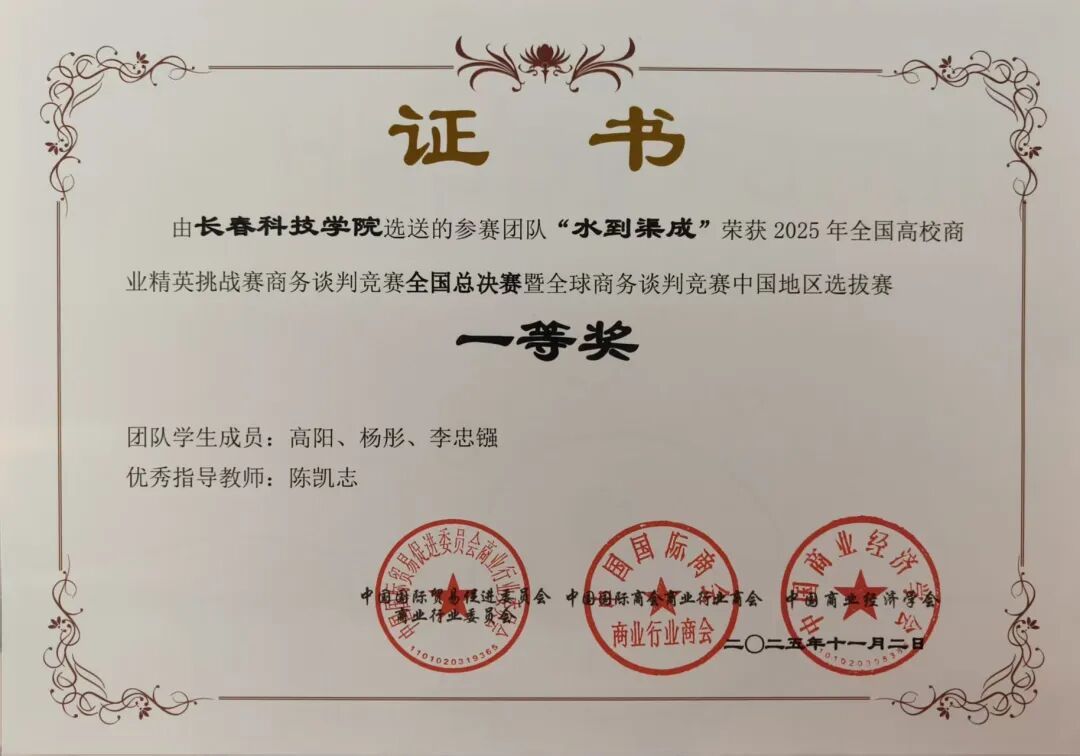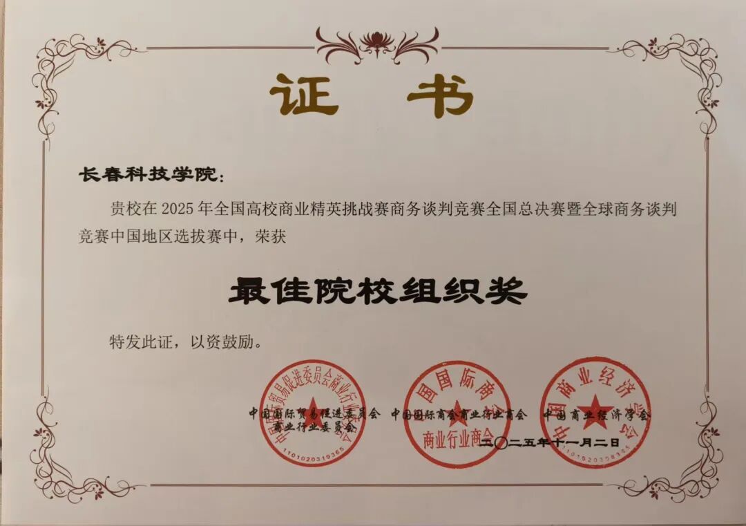 在本次竞赛中,长春科技学院学子展现出卓越的谈判技巧、扎实的专业知识以及出色的团队协作精神,共7支参赛团队斩获国家级奖项。其中,由陈凯志老师指导,高阳、杨彤、李忠镪三位同学组成的“水到渠成队”凭借其清晰的谈判思路、灵活的应变能力和扎实的商务功底,在总决赛中脱颖而出,荣获全国一等奖。此外,学校还斩获了二等奖3项、三等奖3项的优异成绩。鉴于学校在赛事组织、团队培育与参赛规模上的突出表现,组委会特授予长春科技学院“最佳院校组织奖”。