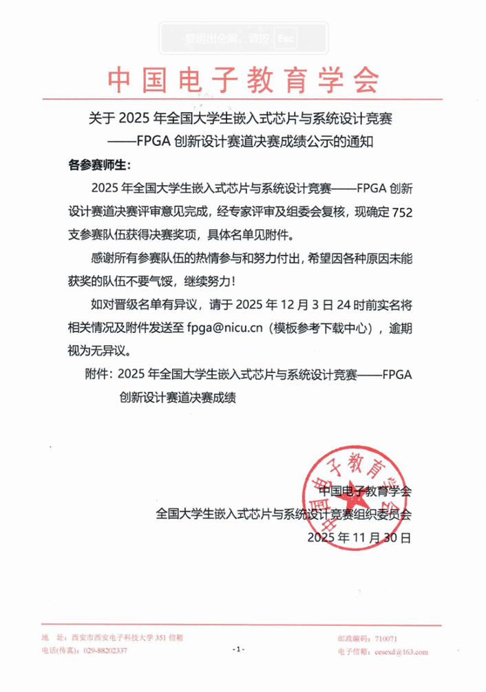 其中,FPGA创新设计赛道因高技术门槛、高创新要求,成为本届赛事的“硬核战场”——342所院校的3901支队伍、10499名学子在此展开激烈博弈,从方案设计到技术落地,每一环都彰显着专业实力的较量。最终,全国仅752支队伍突破重围、斩获国家级奖项(一等奖100支、二等奖188支、三等奖464支),获奖比例不足20%,其含金量之高、竞争之激烈,堪称电子信息领域的“巅峰对决”学校具体获奖名单如下: