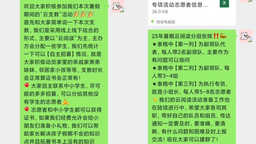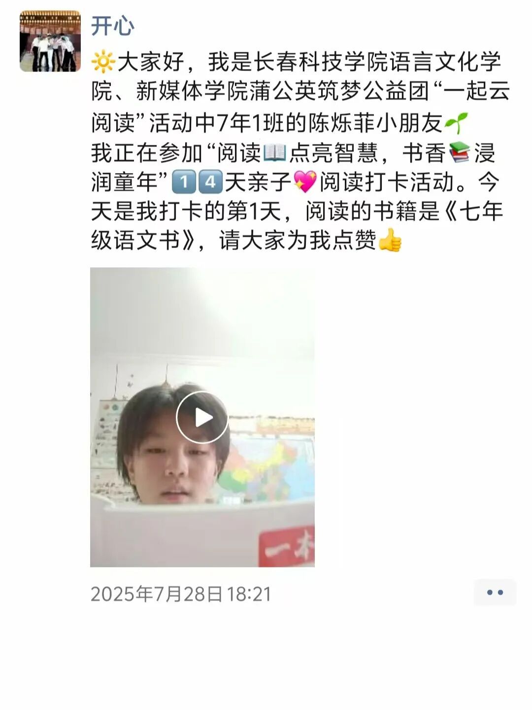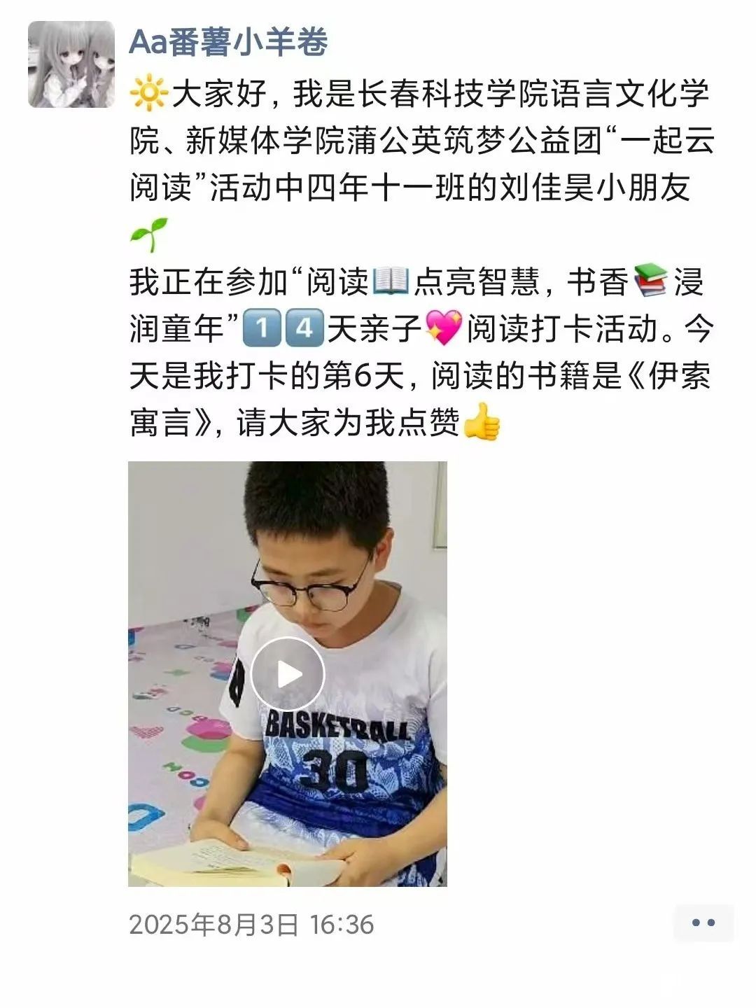 为持续推进“一起云支教”大学生社会实践与志愿服务活动,我院蒲公英筑梦公益团于2025年暑假启动“云阅读”专项活动。活动采用线上线下结合模式,以“一对一”帮扶形式聚焦青少年综合素养提升,切实开展相关服务。