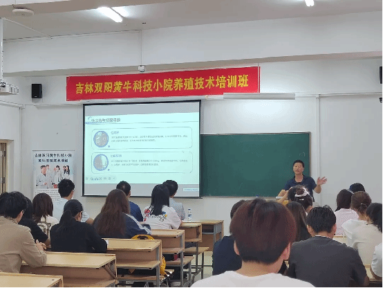 为将前沿畜牧技术与实践经验融入校园教学,近日,学校特邀双阳区畜牧总站高级兽医师、吉林双阳黄牛科技小院技术专家于长忠老师,开展以提高黄牛繁殖改良技术为主题的科普讲座。双阳区科协赵志军主任等领导莅临指导,生命科学学院动物科学专业主任刘春杰、教师王泽、包欣宇及 2022 级、2023 级动物科学专业学生共同参与,现场学习氛围浓厚。