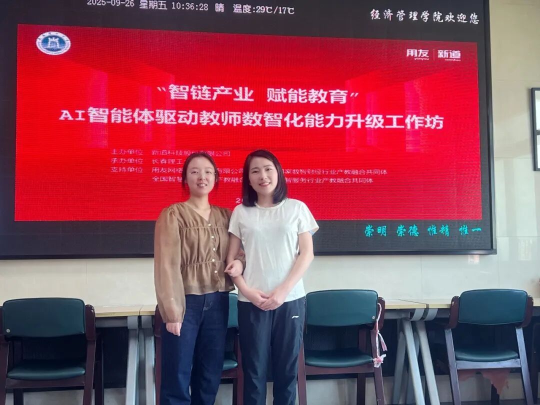 9月26日,经济与管理学院财务管理专业副主任赵士娇和教师蔡金雨,前往长春理工大学参加由新道科技股份有限公司主办的“智链产业 赋能教育”AI智能体驱动教师数智化能力升级工作坊研修会。精准对接教育数字化转型需求,助力专业教学质量提升。