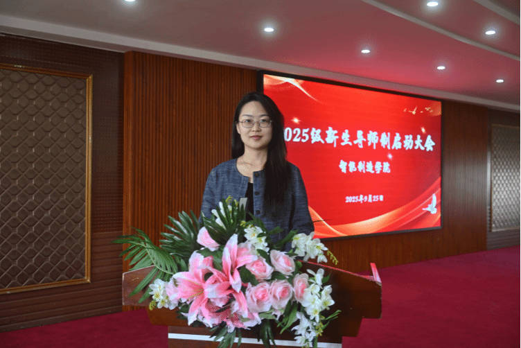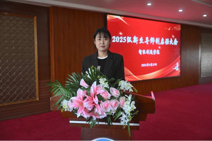 会议伊始,主持人赵雪老师对到场的领导、教师及新生们表达热烈欢迎。她提及,学院始终将学生成长与人才培养放在核心位置,此次推行的学生导师制度意义重大。赵雪老师简要介绍《智能制造学院关于推行学生导师制度的实施办法(试行)》的核心内容,以“三全育人”理念为引领,遵循协同育人、专业导向、服务发展三大原则,界定了导师在心理与学业指导、日常工作推进等方面的职责,同时规范导师选聘条件、程序及考核激励机制,为制度落地实施提供清晰指引。
