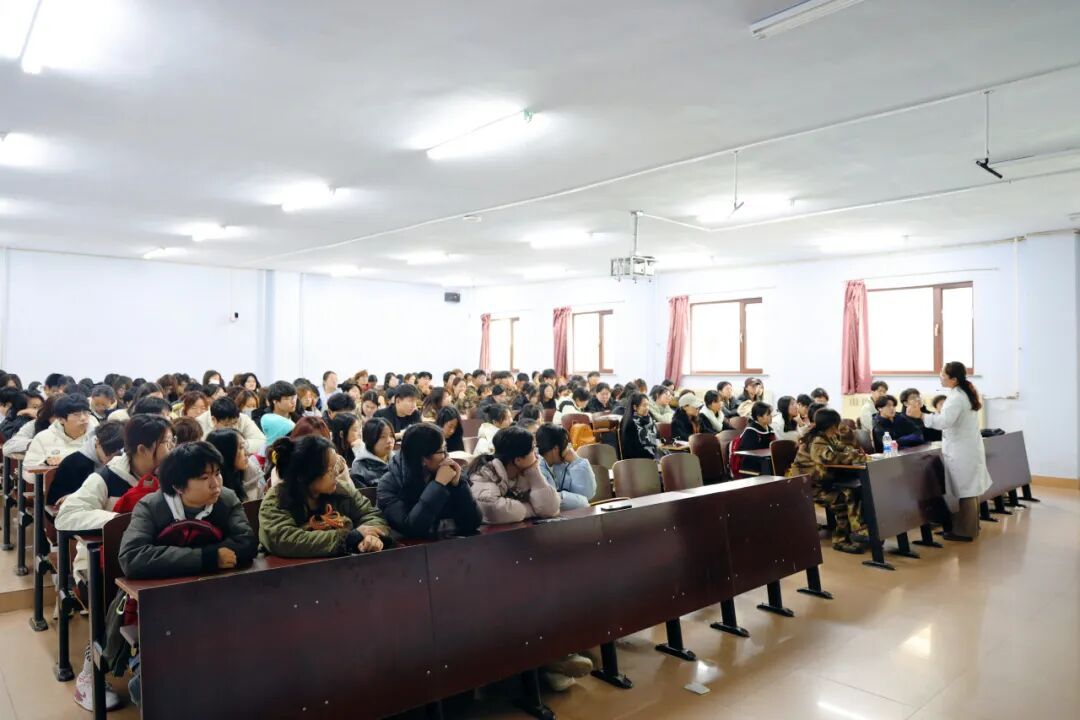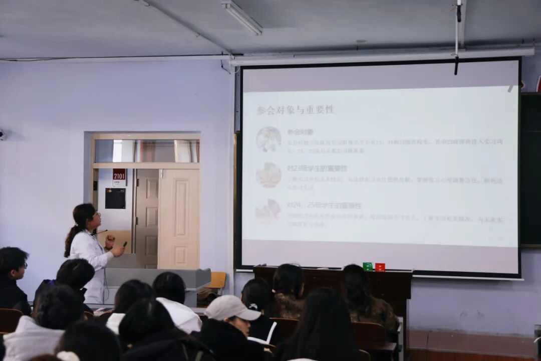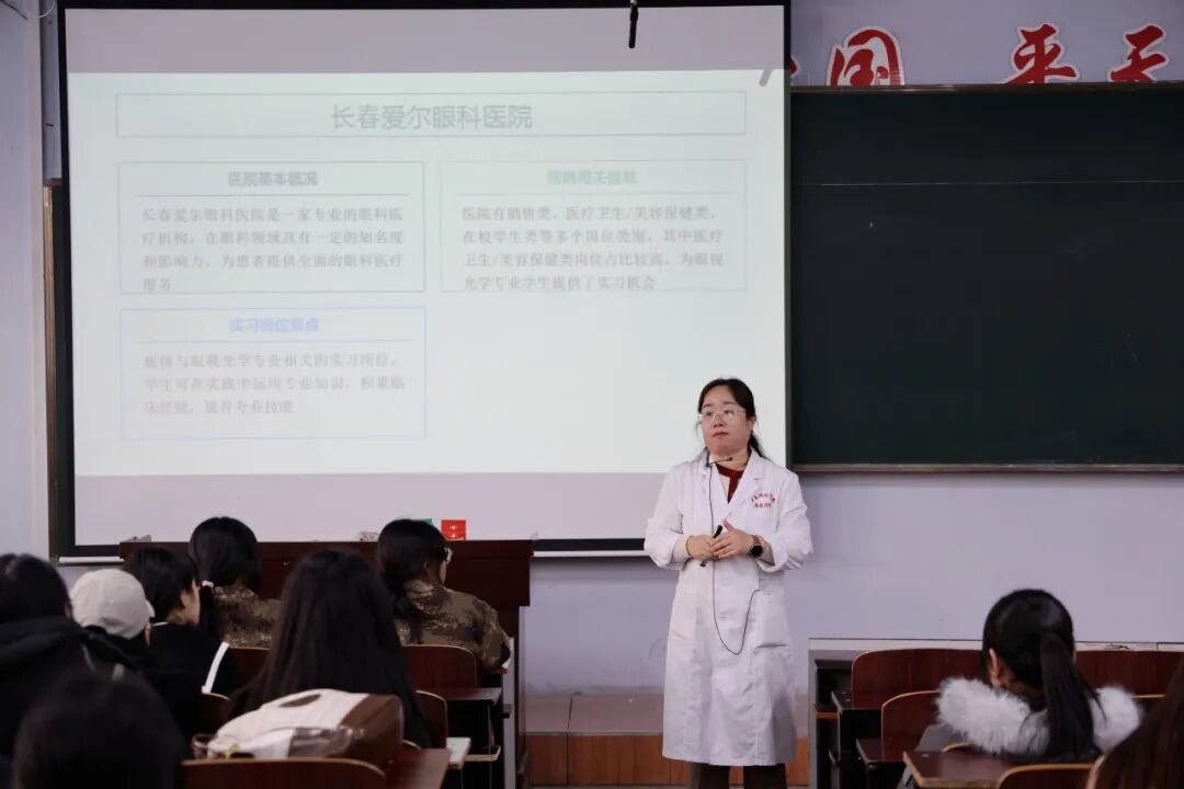 宣讲过程中,王晓晶老师聚焦同学们实习前的核心需求,重点介绍了长春一诺眼科医院、长春爱尔眼科医院、长春易视顿眼科医院等合作医院的情况:既提及各医院的特色诊疗领域与设备优势,也明确了为同学们开放的视光助理、验光、近视防控等实习岗位方向,帮助大家清晰不同单位的适配性,为选择实习单位提供依据。
