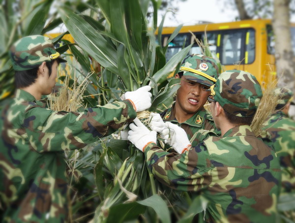 在区委、区政府各有关部门的指导和老师的率领下,预备役大学生心中只有一个信念:多拯救一颗玉米,就多一分收成。同学们头顶烈日,脚踏泥泞,争先恐后地在垄沟垄台间忙碌,将已经倒伏且平铺于地上的玉米逐一扶起,并牢固地捆绑在一起。据军体教研部主任刘晓辉介绍:听完任务动员的大学生们表示,帮助农民“抢扶”是我们义不容辞的社会责任。在校的预备役大学生都自觉放弃了“双休日”,积极踊跃报名参加救灾劳动。