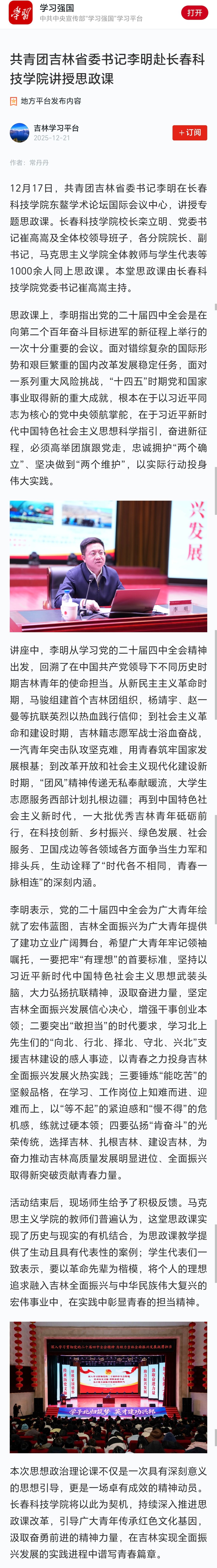 共青团吉林省委书记李明赴长春科技学院讲授思政课