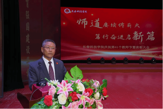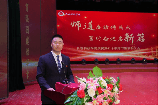 秋阳溢彩,杏坛芬芳。9月10日,长春科技学院庆祝第41个教师节暨表彰大会在东鳌学术论坛—国际会议中心举行,向辛勤耕耘在教育教学一线的全体教职工致以节日问候,表彰在教书育人、科研创新、管理服务等工作中作出突出贡献的先进集体和个人。东华教育集团副董事长、长春科技学院副董事长张津格,长春科技学院校长栾立明及其他校领导出席大会,各分院、各处室负责人,教师、学生代表及特邀荣休教师代表共千余人齐聚一堂,共庆属于广大教育工作者的光荣节日。