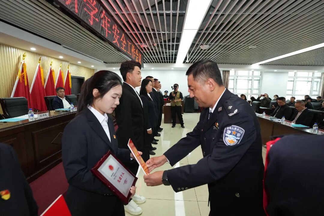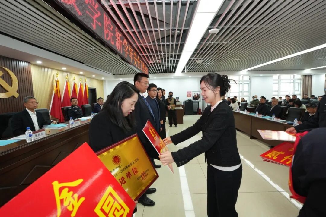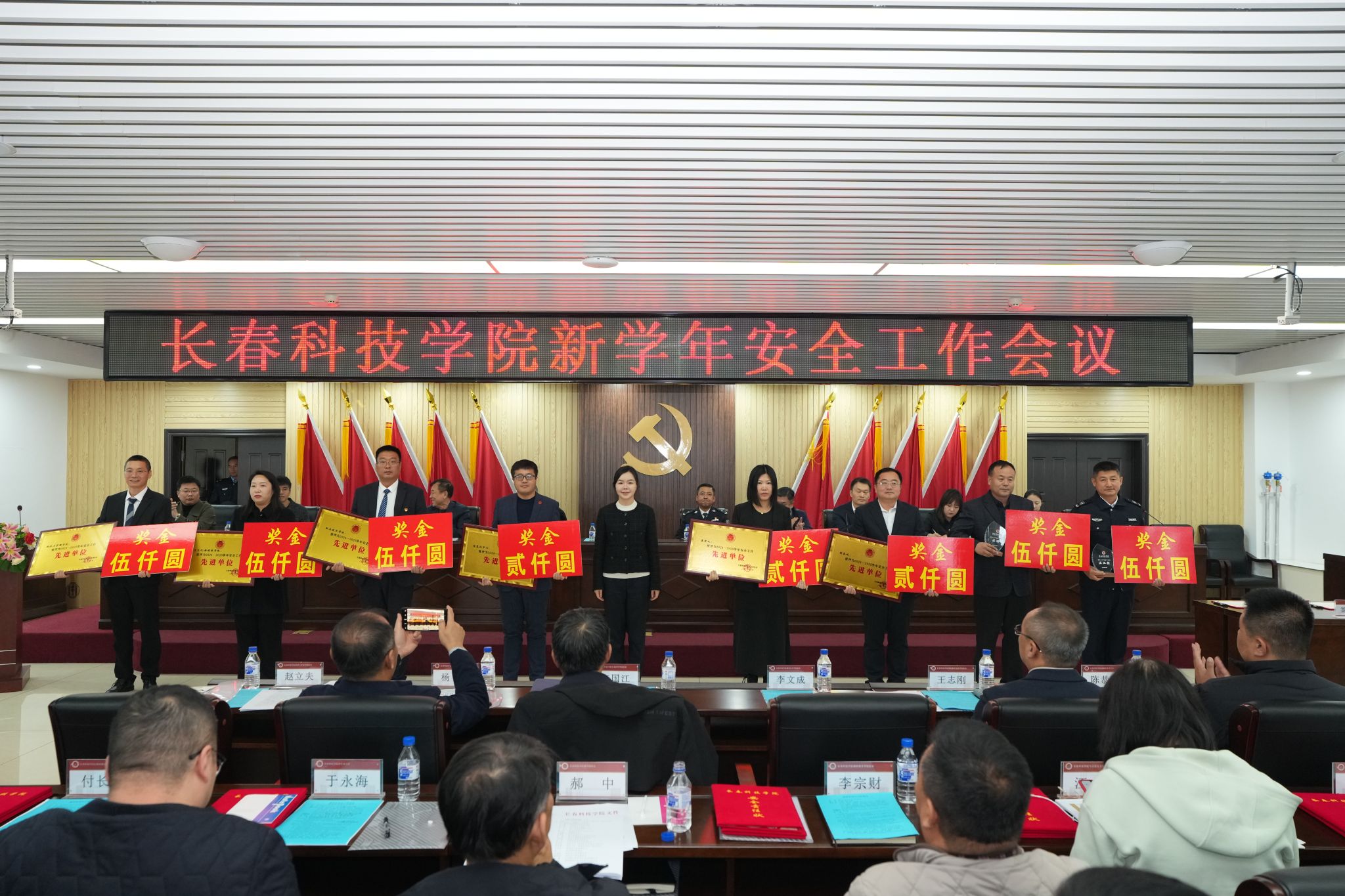 会上,党委副书记宋学山总结了上学年安全工作开展情况,明确了新学年安全工作目标任务;副校长刘晓辉宣读了《关于调整长春科技学院安全委员会的通知》;副校长张代治宣读了《关于表彰2024-2025学年安全工作先进单位、先进个人、优秀安全监理员的通报》和《关于表彰“安全工作突出贡献奖”的通报》;副董事长张津格、双阳区交管大队大队长张习民、校长栾立明分别为突出贡献奖、先进单位、先进个人和优秀安全监理员代表颁奖;经济与管理学院院长赵立夫、语言文化学院、新媒体学院党总支副书记张贺亮、职业技术学院学生玉嘉琪分别代表先进单位、先进个人和优秀安全监理员作了交流发言。