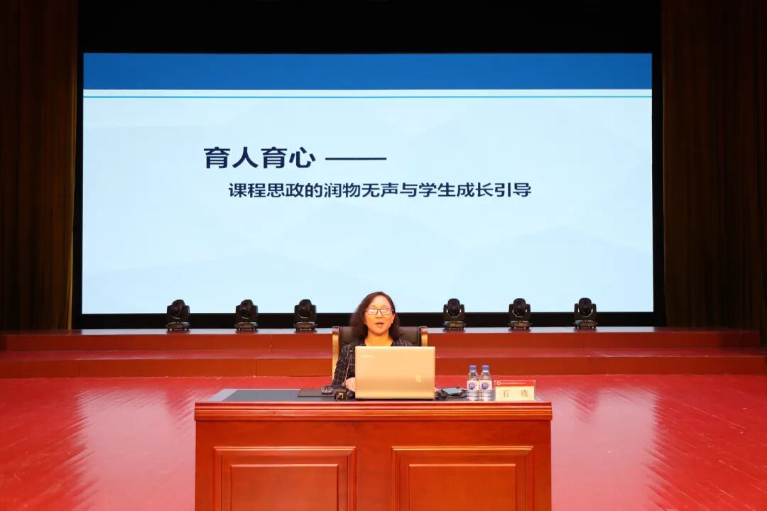 仪式最后,特邀专家石瑛教授作《育人育心——课程思政的润物无声与学生成长引导》专题报告。作为吉林省教学名师、国家一流课程负责人,石瑛教授结合自身多年研究与实践经验,从“课程思政的守正与创新”“思政元素的挖掘技巧”“融合教学的实践路径”“思政育人与人才培养的协同”四个维度展开分享,既用理论阐释了“润物无声”的育人精髓,又以理工科、文科、艺术类等不同学科的课程案例,讲解了思政元素与专业教学的融合方法,为在场教师提供了极具指导性的实践思路。报告结束后,在场教师纷纷表示“干货满满、深受启发”,为后续开展课程思政教学打开了新视野。