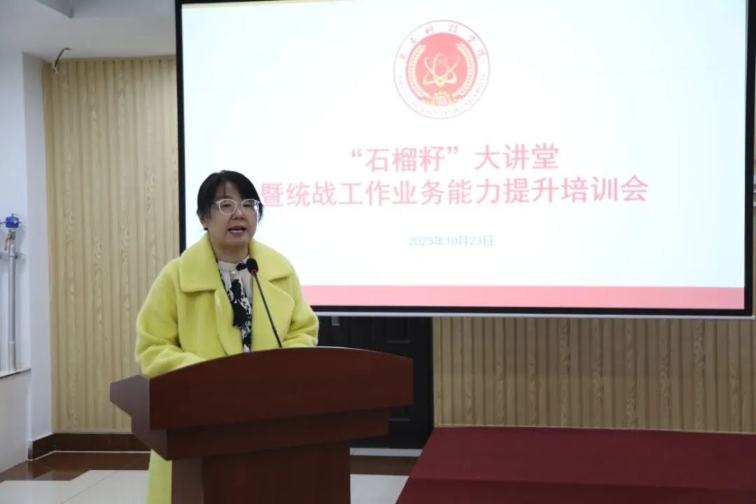 为贯彻落实习近平总书记在中共中央政治局第二十二次集体学习时的重要讲话精神,将理论学习转化为实践动力,切实提升统战工作专业化水平,铸牢中华民族共同体意识,10月23日党委统战部在411会议室举办“石榴籽”大讲堂暨统战业务能力提升培训会。各党总支副书记、宣传委员、统战委员,党支部书记、宣传统战委员,全体辅导员和宣传部、统战部、学生处、保卫处全体教师参加,会议由党委统战部副部长仪虹玲主持。