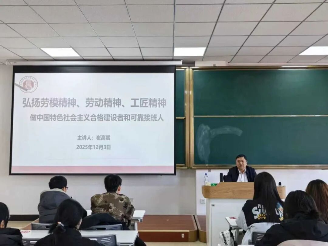 2025年12月3日,党委书记崔高嵩以学校承办的吉林省第四届职工职业技能大赛为背景,为学生们讲授了一堂生动的“三种精神”思政课。他强调,青年学生要从技能大赛中汲取精神力量,深刻领悟劳模精神、劳动精神、工匠精神内涵,在劳动实践中锤炼品格,争做中国特色社会主义合格建设者和可靠接班人。