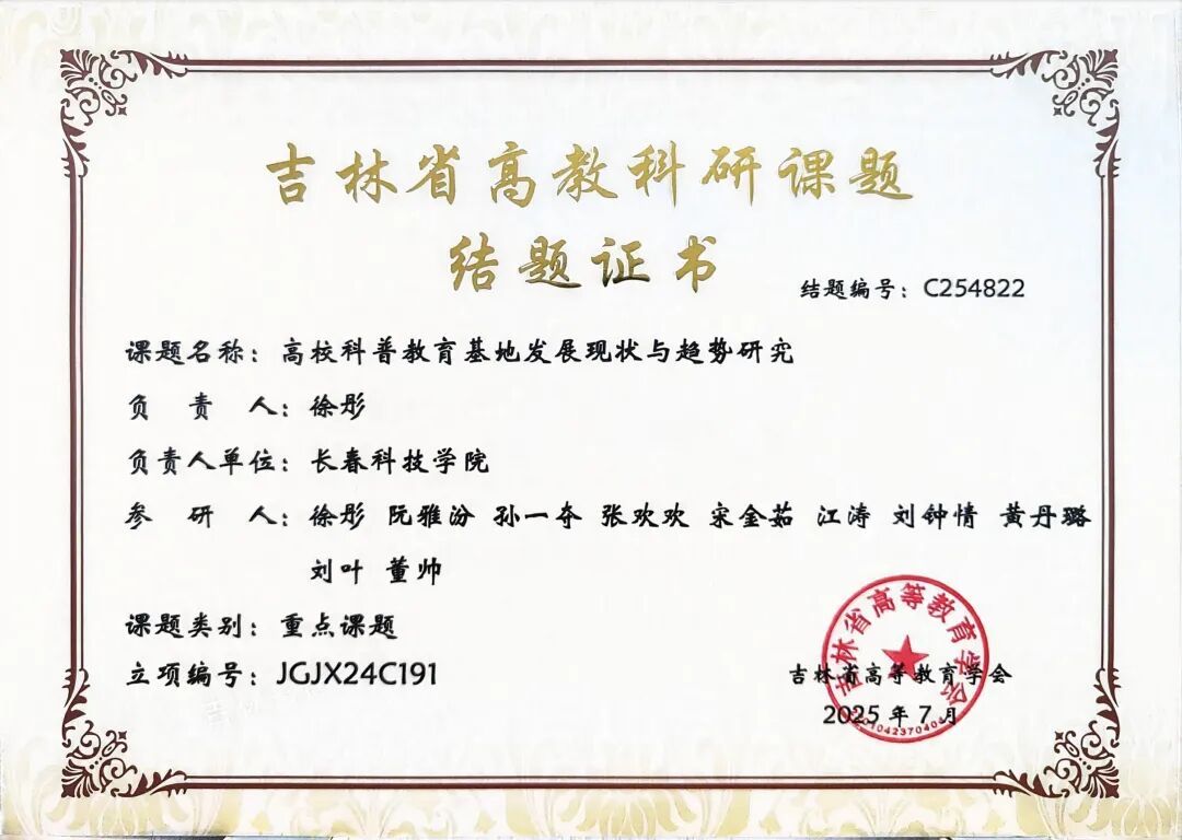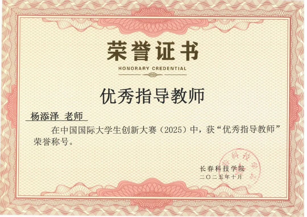 2025年,研究院教师在师德师风与综合贡献方面屡获殊荣。唐玉娇教授先后荣获 “吉林省优秀教师”、“科研、学科建设突出贡献奖”、“长科好人 最美教师暨黄大年式好老师”及“师德标兵”等多项荣誉,唐玉娇、刘畅、陈新源、杨添泽、贾新傲、李雨航老师在中国国际大学生创新大赛(2025)中,获“优秀指导教师’荣誉称号,这些荣誉的获得充分体现了研究院教师队伍的政治素养与学术担当。