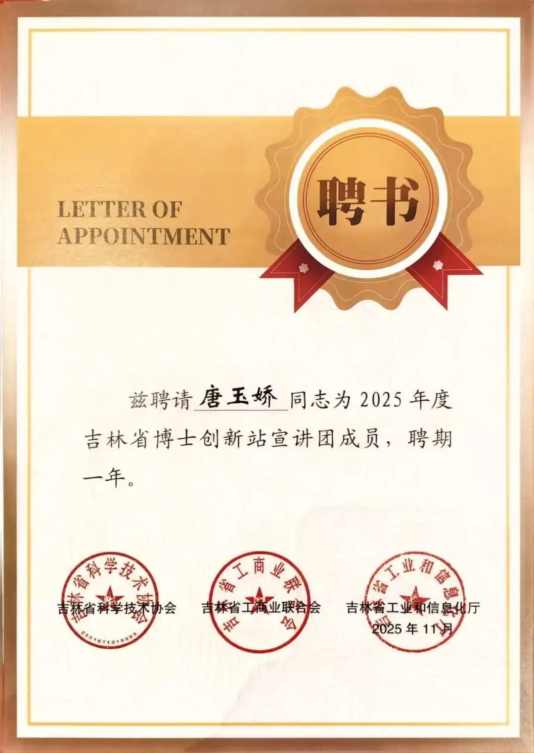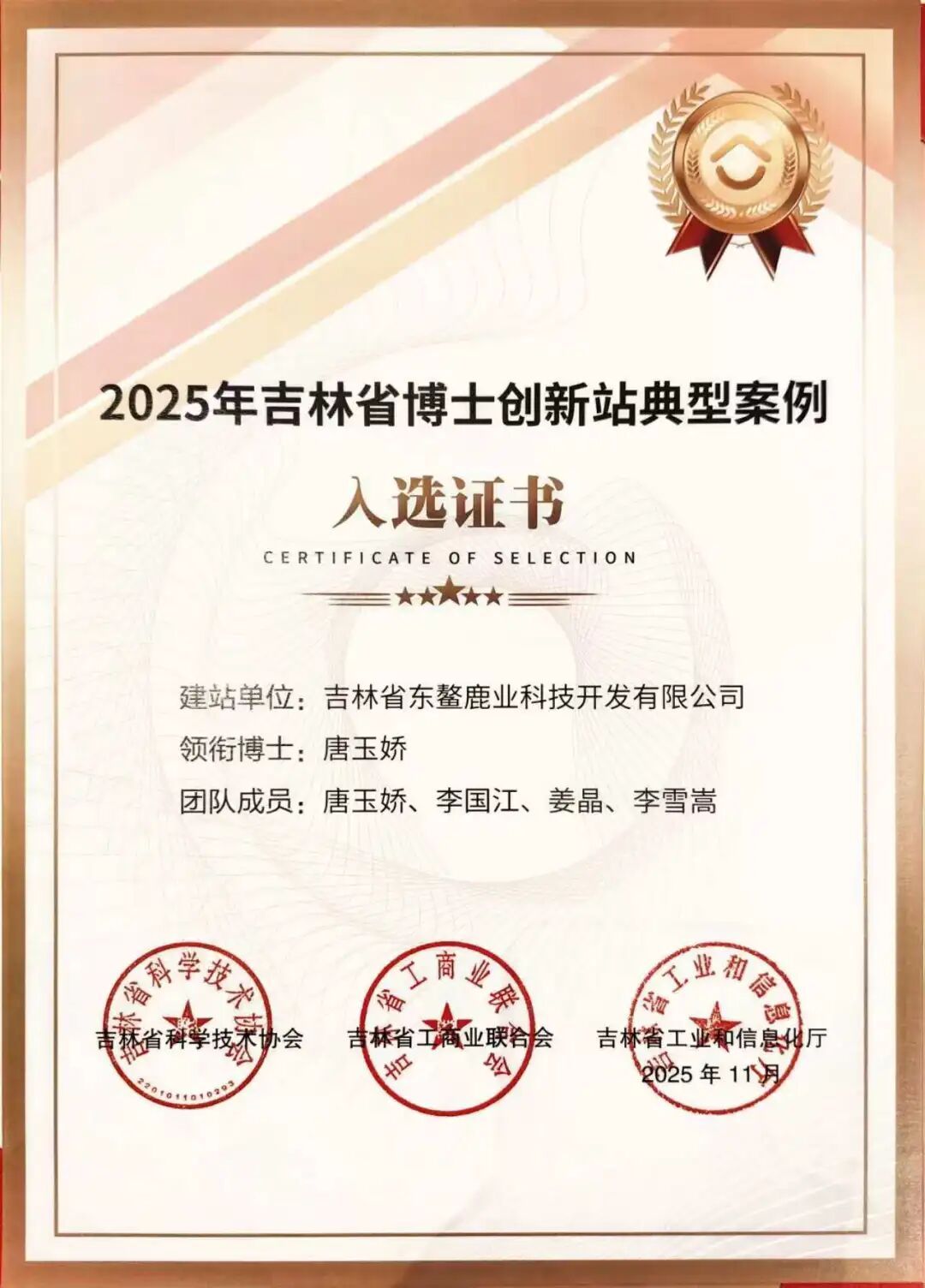 由唐玉娇博士领衔建设的“吉林省东鳌鹿业科技开发有限公司博士创新站”,成功入选吉林省首批 27 个博士创新站典型案例,成为我省鹿产业科技创新的重要样板。唐玉娇博士被聘为 2025 年度吉林省博士创新站宣讲团成员。此外,中国农技协吉林双阳鹿科技小院在 2025 年度评价中获评 “五星科技小院”,充分彰显了研究院在服务产业、服务基层中的示范引领作用。