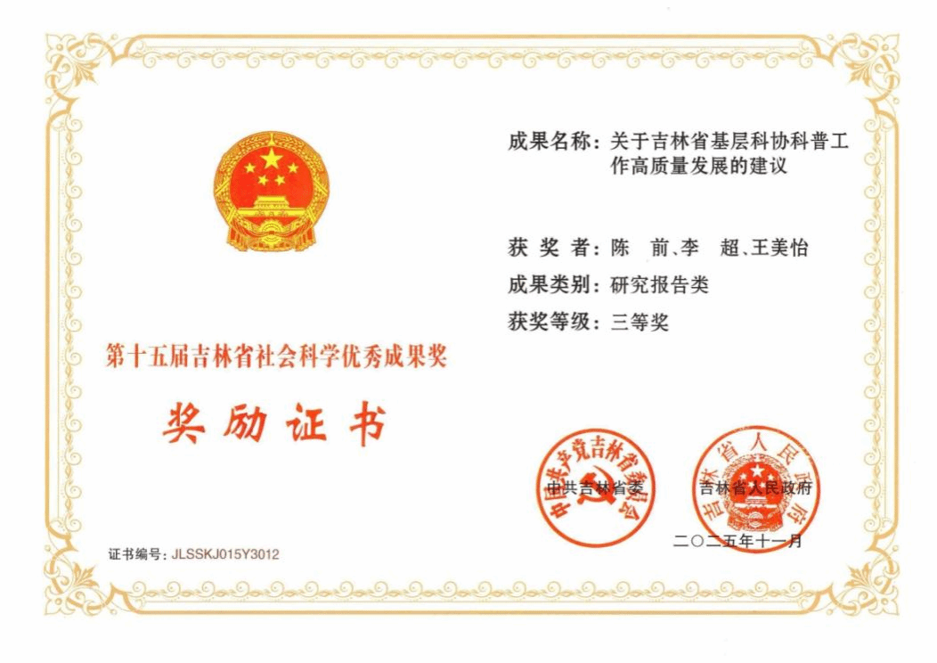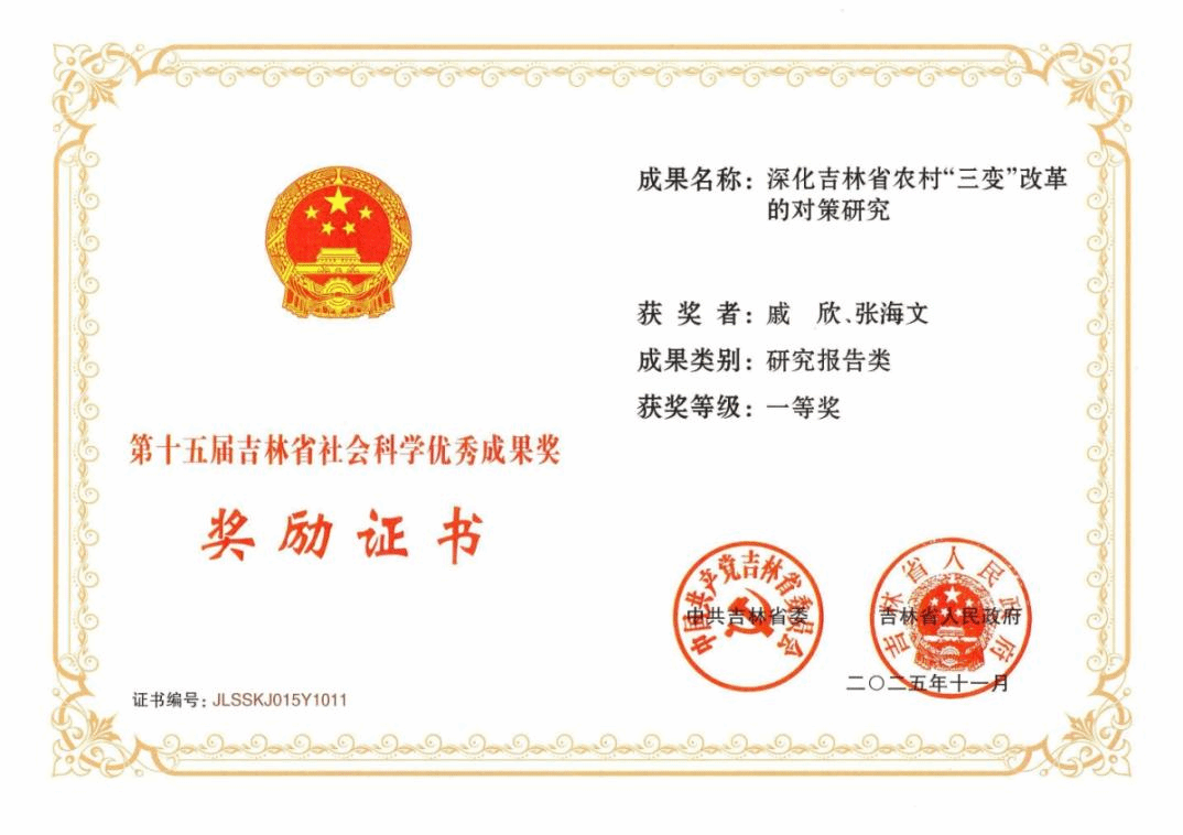 2025年度吉林省社会科学优秀成果奖评选中,戚欣教授团队的《深化吉林省农村“三变”改革的对策研究》获研究报告类一等奖,陈前副研究员团队的《关于吉林省基层科协科普工作高质量发展的建议》获研究报告类三等奖,学校首次获得实现历史性突破。作为由中共吉林省委、吉林省人民政府设立的我省哲学社会科学最高奖,本次获奖彰显了学校人文社科研究的深厚积淀,更体现了学校服务地方经济社会发展的智库价值。