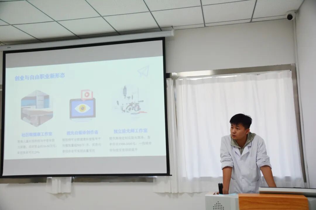 接着,刘博老师围绕眼视光行业全景、职业矩阵等核心模块展开分享,结合本地行业案例与可视化图表,系统梳理多元职业路径,并针对大学各阶段成长重点给出具体规划建议。