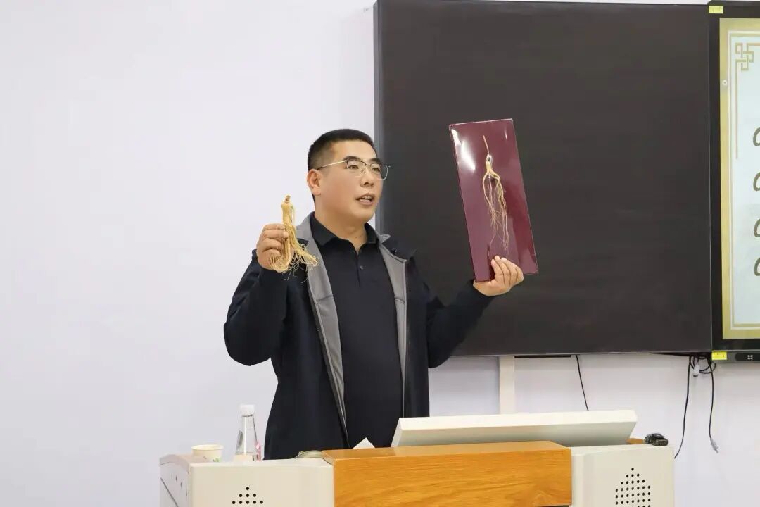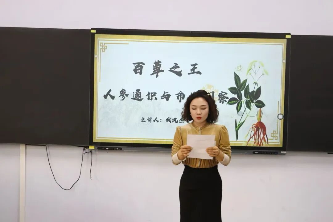 宣讲会上,臧凤杰书记以 “人参会跑” 这一民间传说为引,科学阐释了人参并非真的 “会跑”,而是其根系会随土壤养分分布自然延伸,从而形成 “移动” 的视觉错觉。现场还分发了人参蜜片供师生品鉴,让大家直观感受人参深加工产品的市场潜力。随后,臧书记系统讲解了野生参、林下参、园参三类人参的特点、食用方法与相关禁忌,深入剖析了人参作为 “百草之王” 的文化内涵与现代产业价值。他重点指出,作为吉林省千亿级产业的核心组成部分,人参产业已从传统药材领域全面拓展至饮料、零食、护肤品、文旅体验等多个高附加值赛道,形成了涵盖种植、加工、销售、文化传播的完整产业链,而这一产业升级过程中,正迫切需要兼具参茸文化素养与现代传播技能的专业人才,为大学生提供了广阔的就业创业新蓝海。臧书记结合延边人参交易市场等成功案例,详细介绍了品牌推广、文旅融合、跨境电商等创业方向的实操路径,鼓励同学们立足学科优势参与产业创新。