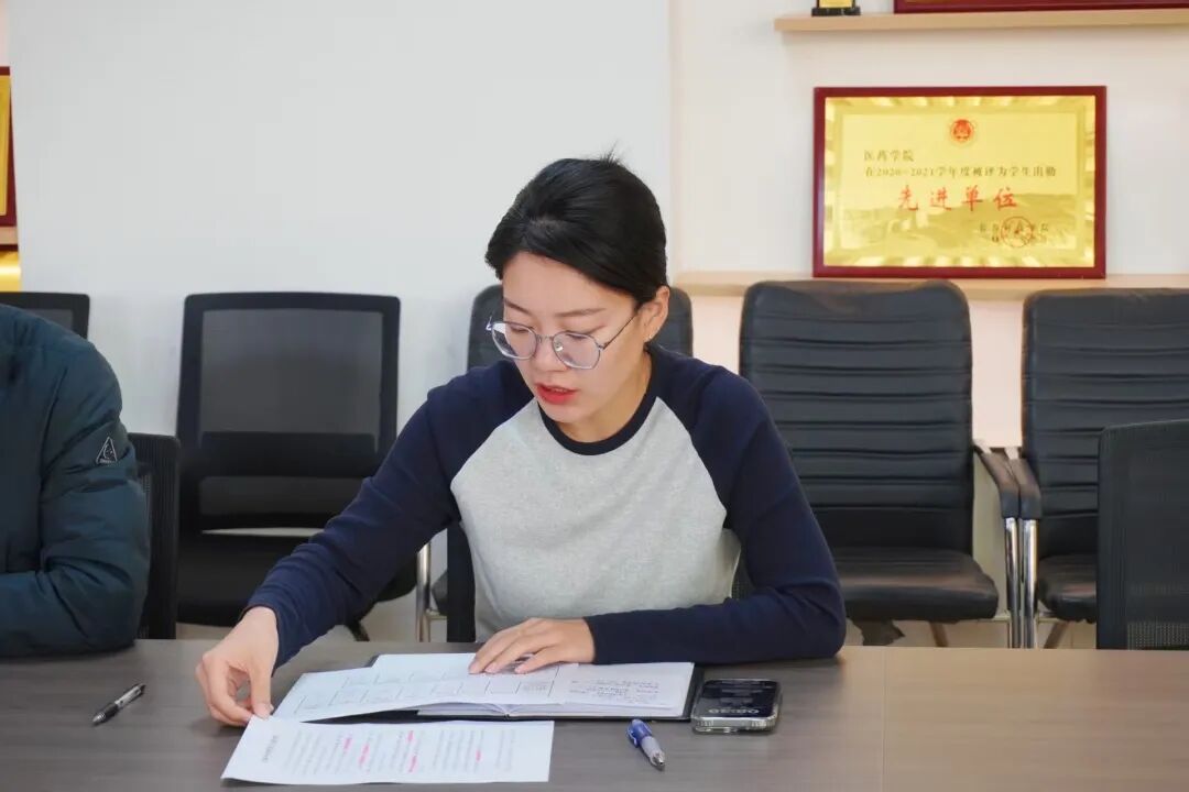 然后,辅导员老师张月则对校奖学金、助学金等表格核对工作进行了详细汇报,确保各项资助数据准确无误。她表示,将持续严把数据质量关,确保各项数据真实准确、无一疏漏,切实保障奖助学金政策精准落地,维护学生的切身利益。