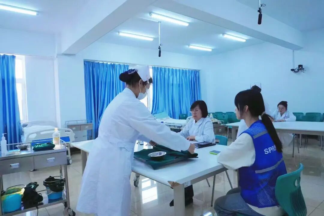 比赛现场,选手们身着规范着装,依次完成七步洗手法、无菌包使用、无菌溶液取用等实操项目。从洗手时的精准揉搓,到打开无菌包时的严格无菌观念,再到取用溶液时的规范操作,每一个细节都彰显着同学们对专业技能的敬畏与钻研。四位护理学专业评委老师李慧敏、孙长波、于雪微和崔颖全程细致观察、公正打分,从操作流程、无菌观念等维度进行综合考评,确保比赛的专业性与公平性。