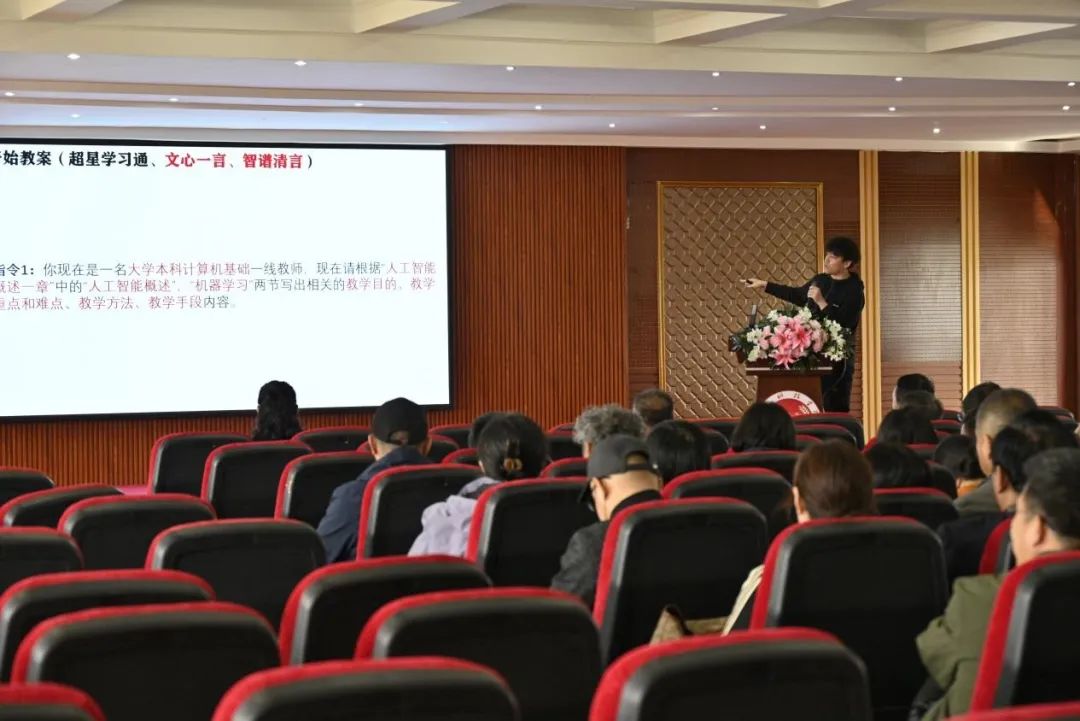 接着,计算机基础教研部的曹金鹏老师以“教师如何把AI压榨到die——教案篇”为主题,用其独特的风趣幽默,深入浅出地向与会教师传授了如何高效利用AI工具进行教案生成的技巧。曹老师的分享重点在于通过直观的数据对比,展示了AI工具在提升教案质量和效率方面的显著效果,并深入比较了“文心一言”和“智谱清言”两款AI工具在执行相同指令时生成教案的差异,以及如何筛选生成内容的技巧。