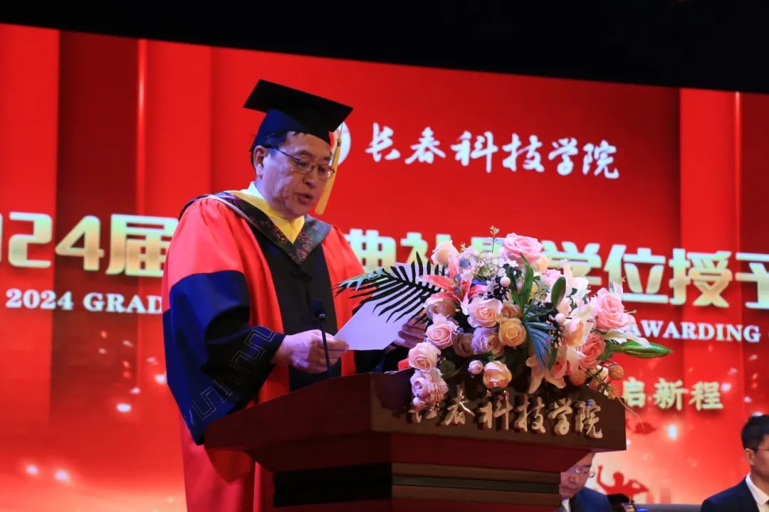 最后由长春科技学院校长栾立明致辞。他代表董事长张电达、学校党政领导班子成员对2024届全体毕业生送上了最诚挚的祝福与殷切的期望。