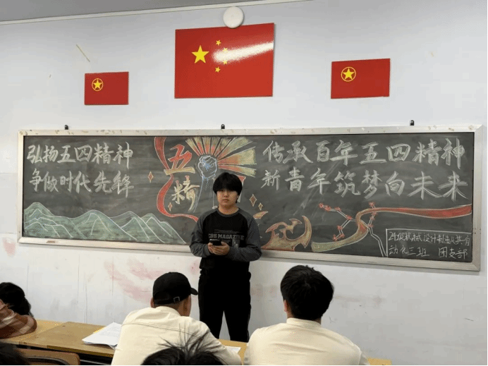 随后,各班主持人详细介绍五四精神“爱国、进步、民主、科学”的核心内涵,通过讲述一个个生动的历史故事,将同学们带回到那个激情燃烧的岁月。从学生们高呼口号游行抗议,到先进知识分子传播新思想新文化,展现出五四青年为追求国家富强、民族振兴所付出的努力与牺牲,让同学们深刻理解五四精神的丰富内涵和时代价值。