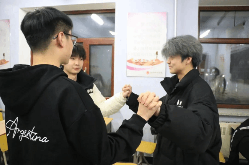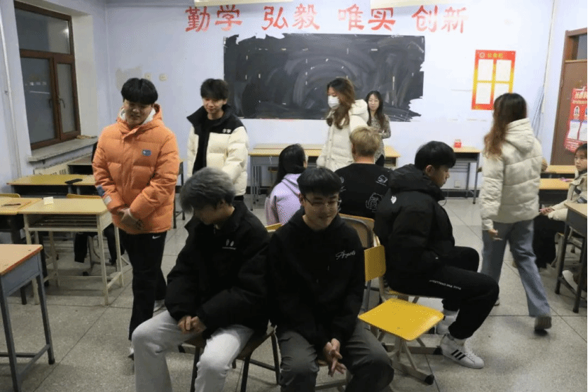 游戏环节将活动推向了高潮。“同舟共济”游戏中,大家紧紧挨在一起,仿佛坐一条船,共同渡河。同学们巧妙地利用身体的灵活性,在狭小的空间中互相帮助。现场气氛紧张而又充满欢乐,同学们的笑声此起彼伏。而被挤出格子的同学们则勇敢地接受惩罚,他们的才艺展示或幽默搞怪,或深情动人,成为舞台上别样的风景。惩罚不再是尴尬,而是青春无畏与洒脱的彰显,让心灵在轻松氛围中愈发坚韧自在。